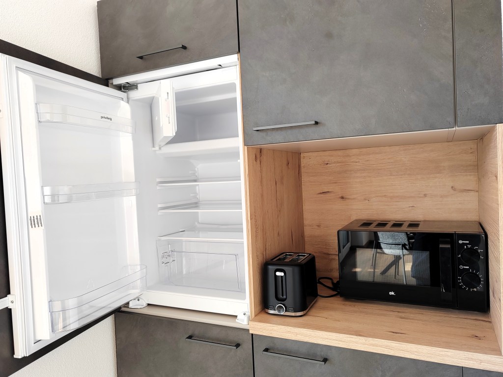 Komplette Küche mit Geschirrspüler, Backofen, Mikrowelle, Kühlschrank, Kaffeemaschine, Wasserkocher.